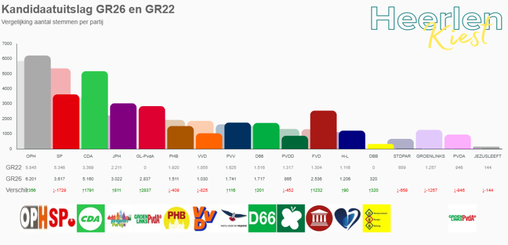 De uitslag van de gemeenteraadsverkiezing op 18 maart 2026 is bekend. Het opkomstpercentage in Heerlen was dit keer 44,2%. De Ouderen Partij Heerlen (OPH) is met 6.201 stemmen de grootste partij in Heerlen. Daarna volgt CDA met 5.160 stemmen. De SP sluit de top 3 met 3.617 stemmen.